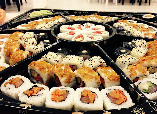 מגש 96 יחידות סושי הכולל  סלמון, טונה וצמחוני. ניתן להזמין צמחוני בלבד.