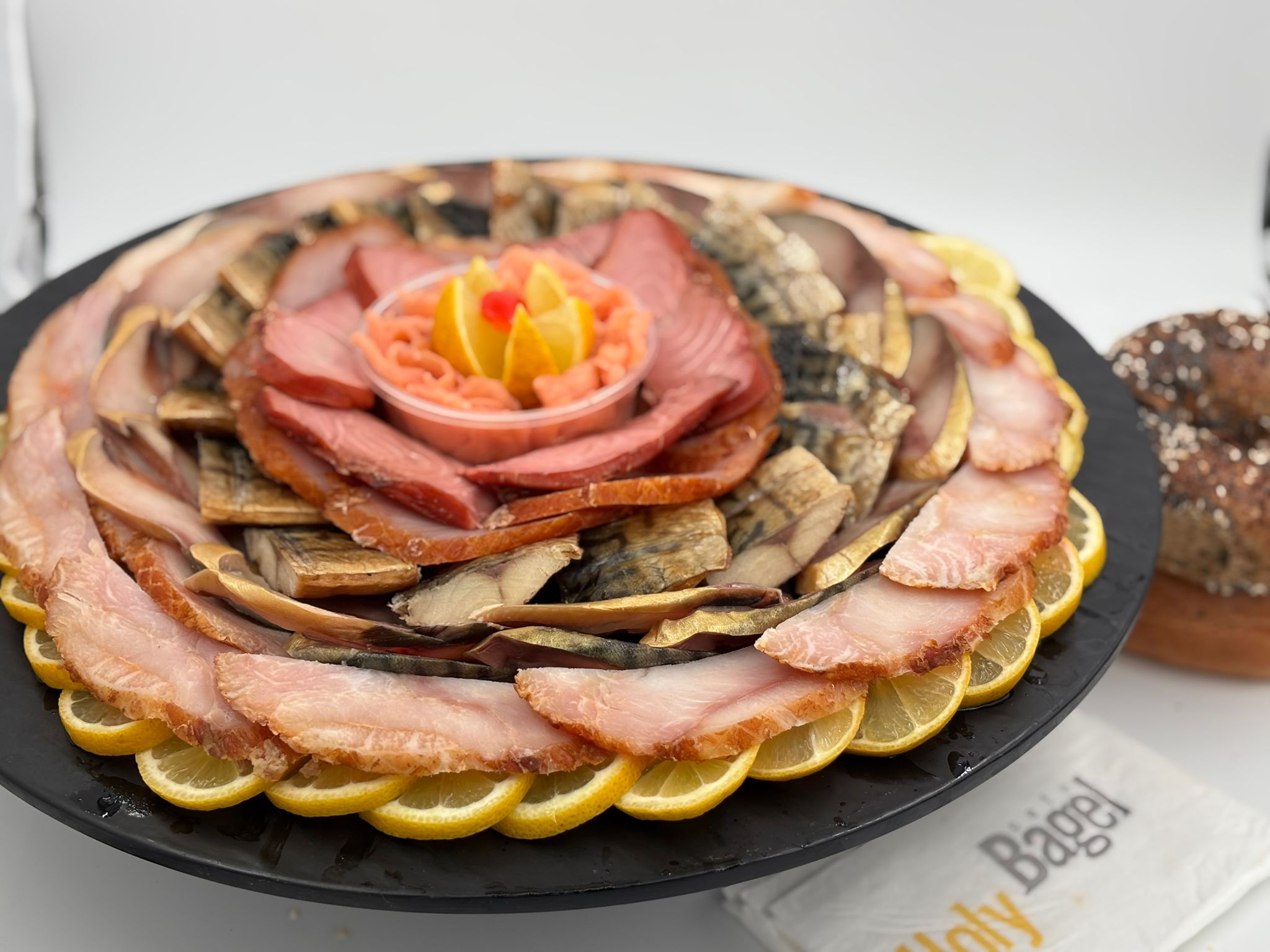 פלטה המכילה מגוון דגים מעושנים: סלמון, טונה, נסיכת הנילוס, מקרוסקה.