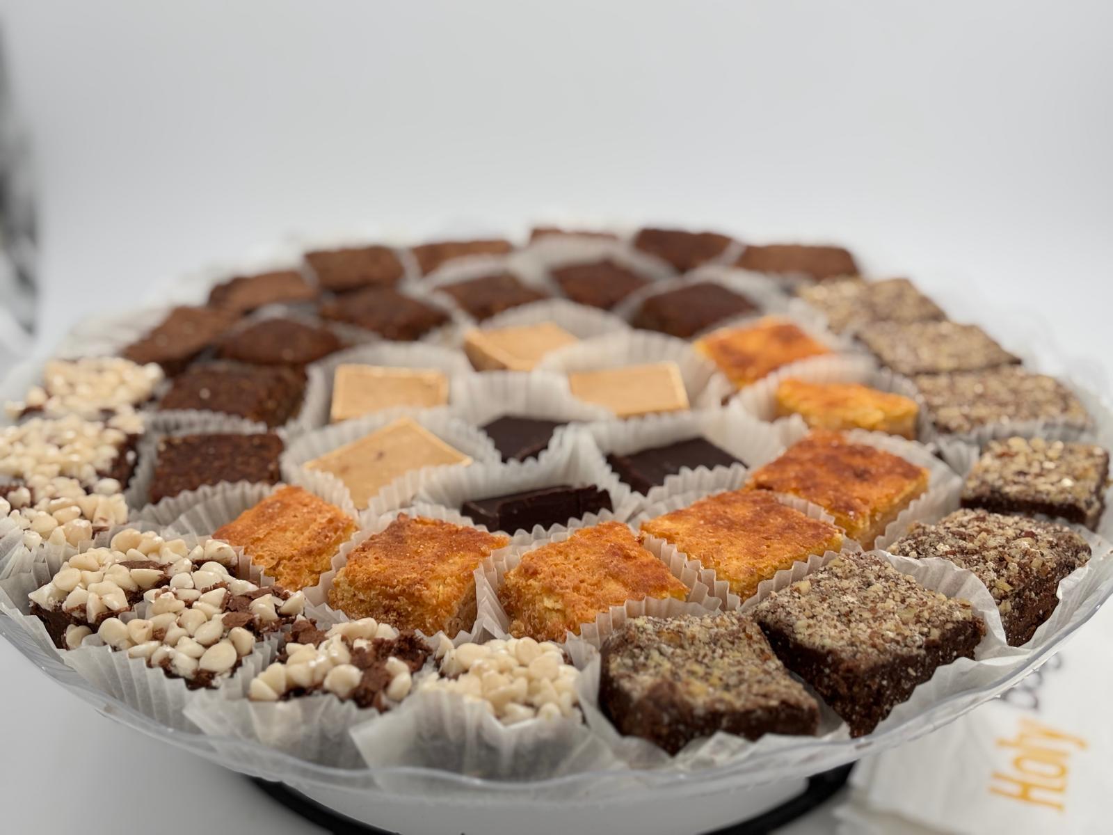 מגש 40 יחידות של בראוניז, גבינה ותפוח עץ מגש כחלק מעמדת מתוקים