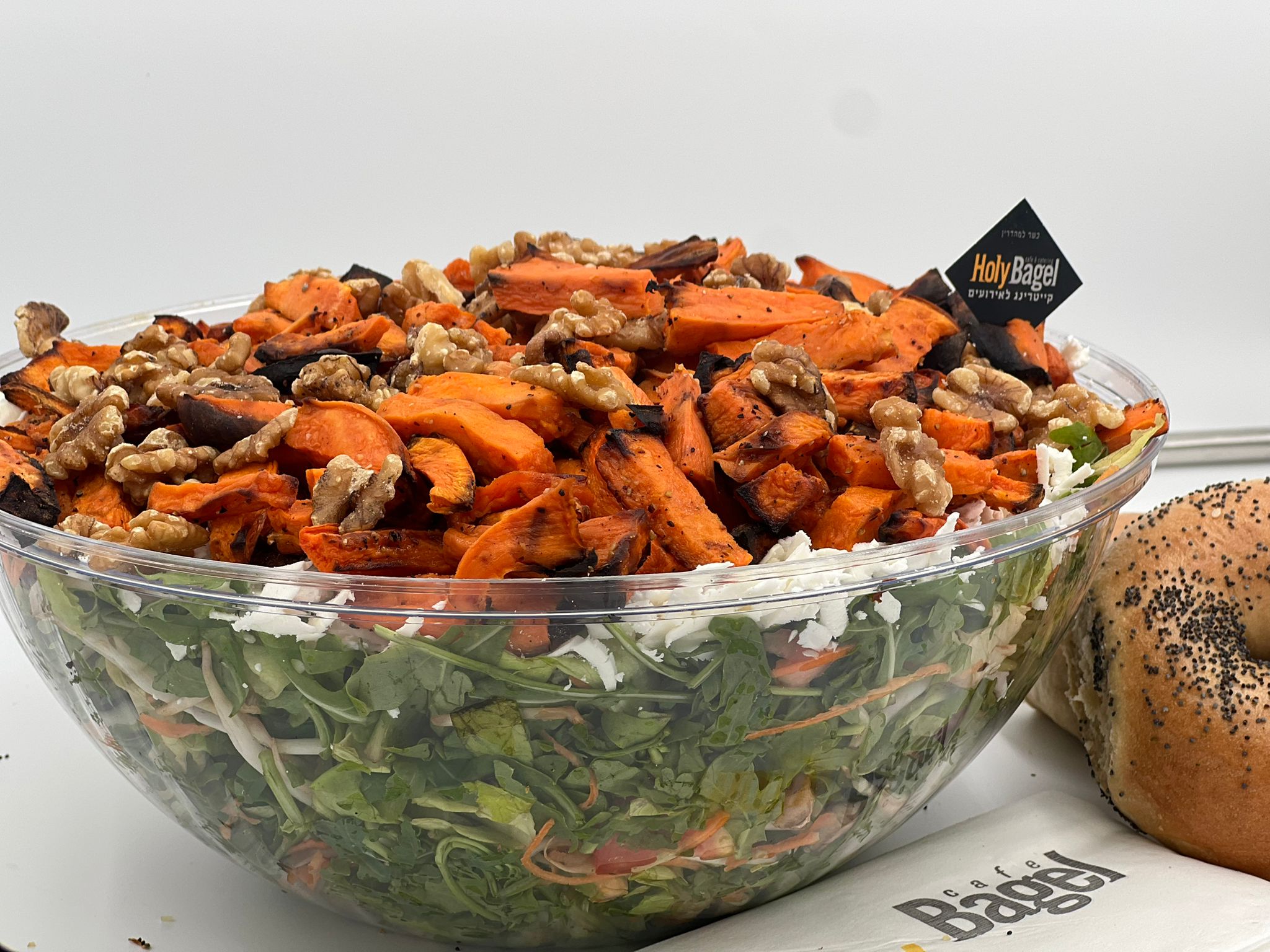 מגוון ירקות חתוכים עם גבינה בולגרית מעל רצועות בטטה ואגוזים
