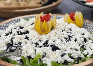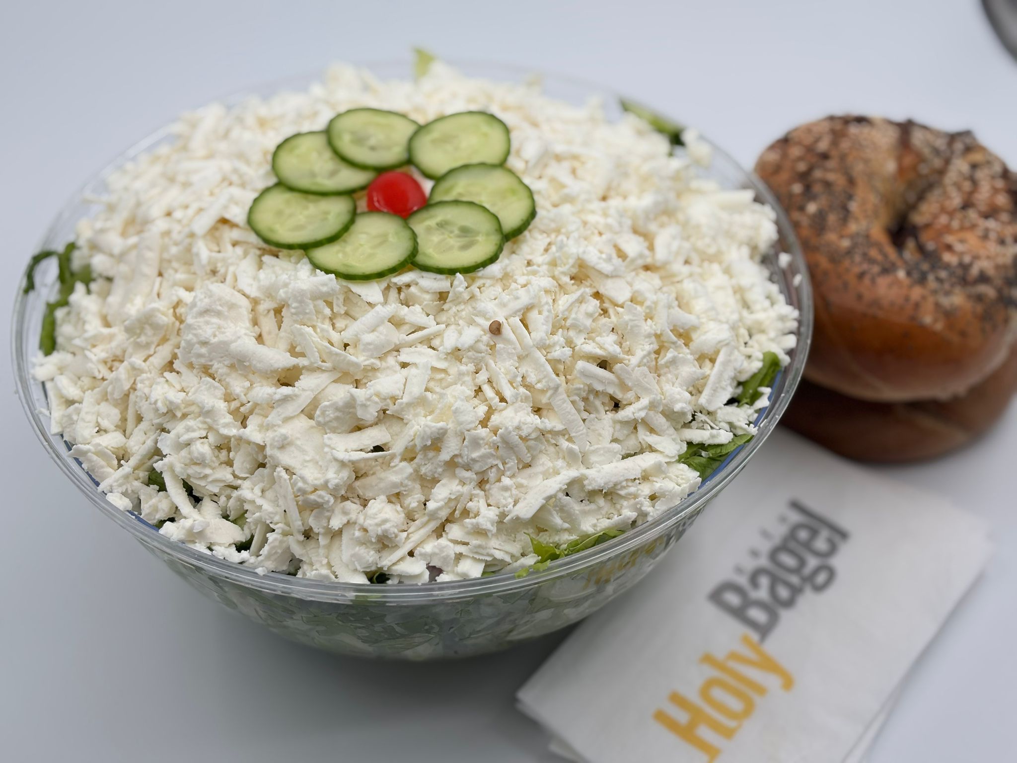 קערת סלט יווני המכיל חסות, מלפפון, בצל סגול, זיתים וגבינה בולגרית מפוררת. מתאים ל 30 איש לערך.