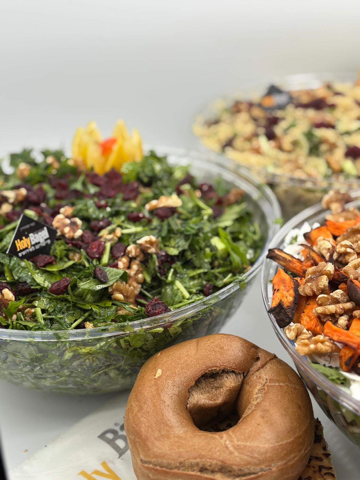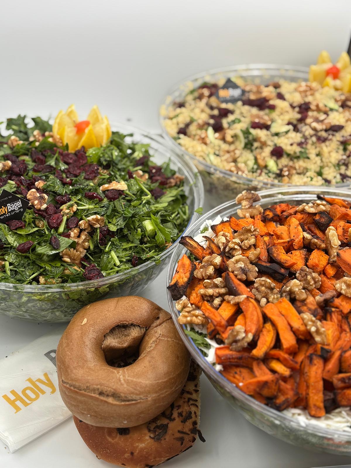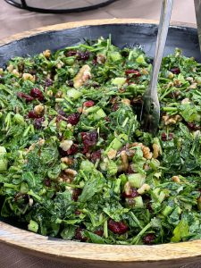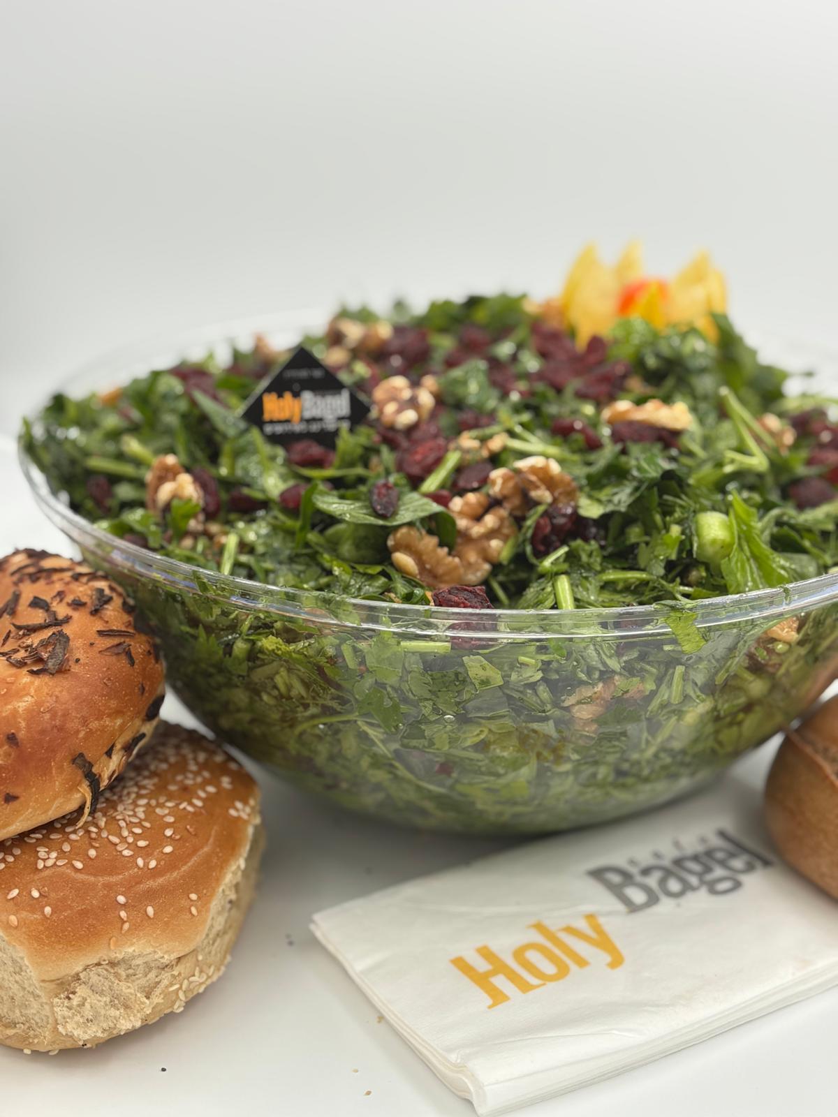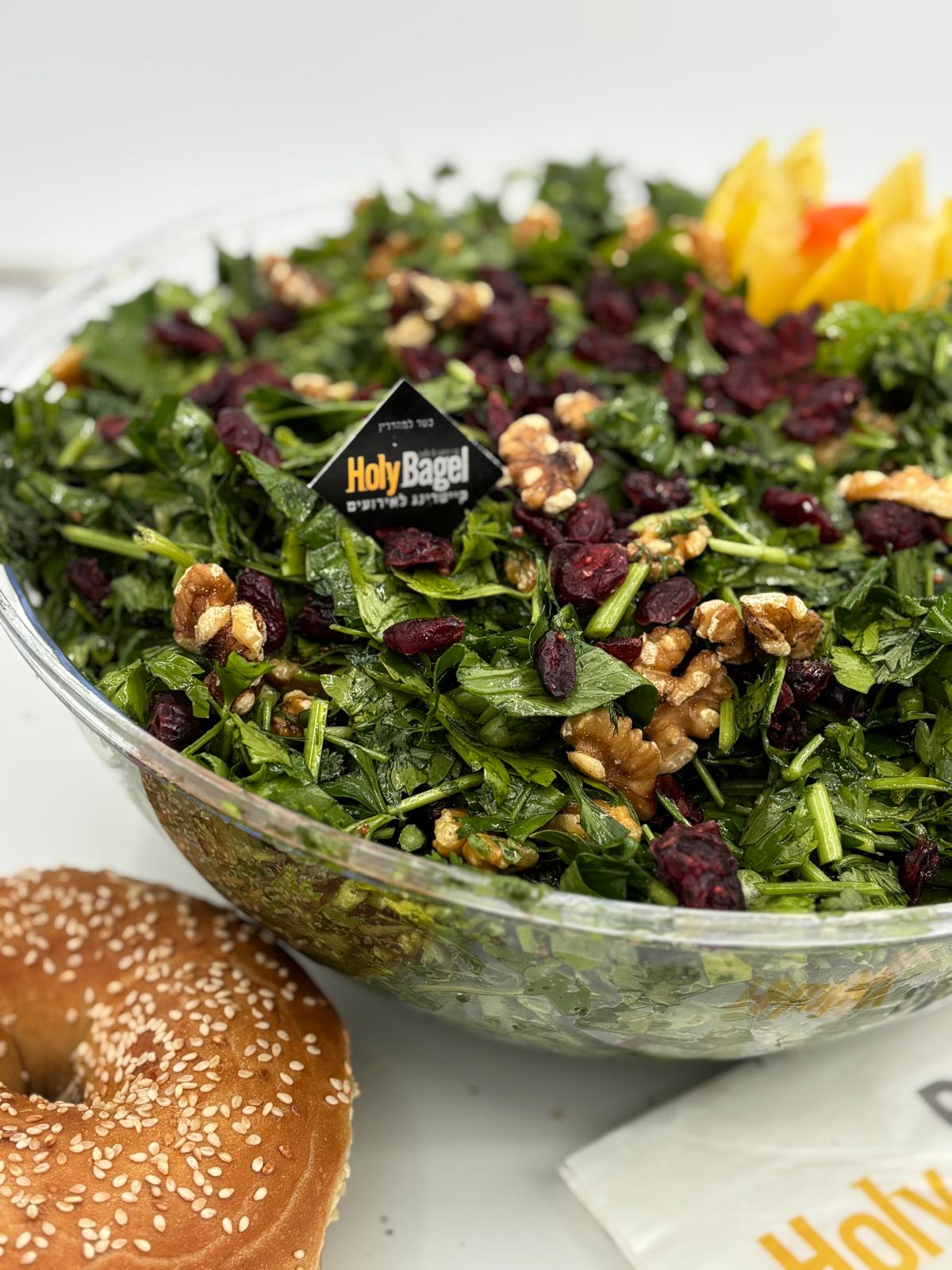 סלט ירוק קצוץ המורכב מכוסברה, פטרוזיליה, שמיר, סלרי, חמוציות, אגוזים ותערובת גרעינים.