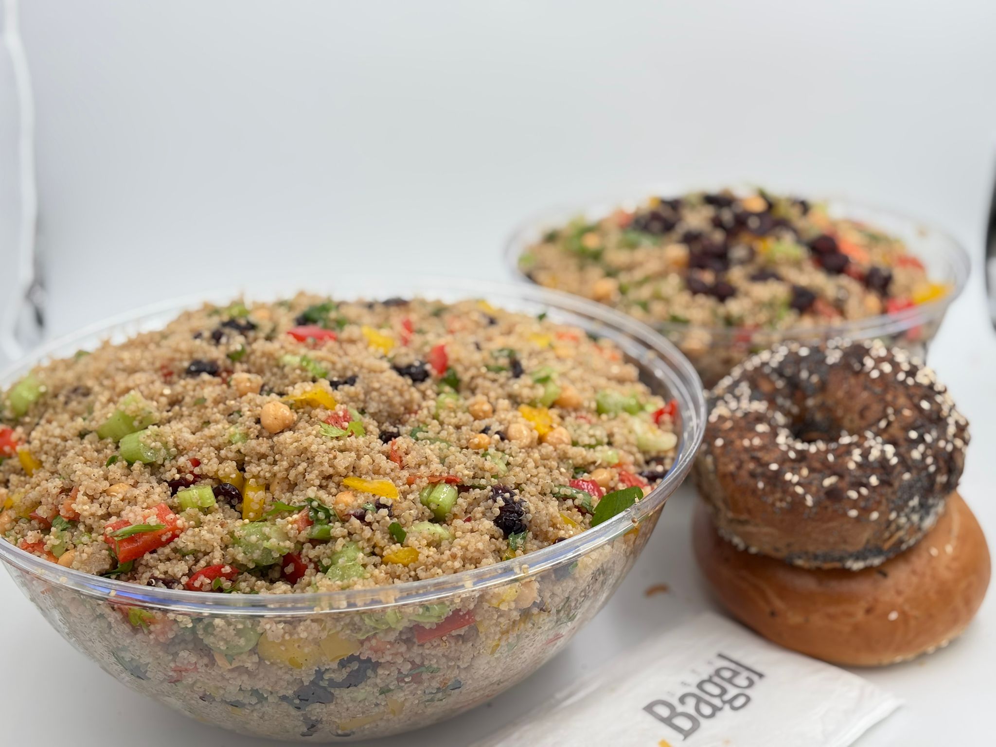 סלט קינואה בריא המכיל אגוזי מלך, גזר, חמוציות, סלק, בצל ירוק ופטרוזיליה. מתאים לטבעונים.
